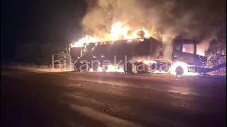 बीकानेर। जिले के लूणकरणसर तहसील के धीरेरां गांव के पास राष्ट्रीय राजमार्ग 62 पर देर रात एक ट्रक में भीषण आग लग गई। बताया जा रहा है कि अचानक सड़क पर पशु आ जाने से ट्रक अनियंत्रित हो गया और सड़क किनारे पेड़ से टकरा गया। टक्कर के तुरंत बाद ट्रक धूं-धूं कर जलने लगा।हादसे के दौरान ट्रक चालक बाबूराम ने सूझबूझ दिखाते हुए चलती गाड़ी से कूदकर अपनी जान बचाई। घटना की सूचना मिलते ही मौके पर सहायक उप निरीक्षक सुरेश मीणा और चालक महावीर प्रसाद पहुंचे और तत्काल फायर ब्रिगेड को सूचना दी।सूचना पर पहुंची फायर ब्रिगेड की गाड़ियों ने कड़ी मशक्कत के बाद आग पर काबू पाया। सहायक उप निरीक्षक सुरेश मीणा ने बताया कि ट्रक गुजरात के मोरबी से कागज के रोल भरकर पंजाब के लुधियाना जा रहा था। हादसे में ट्रक और उसमें भरा सामान जलकर खाक हो गया, गनीमत रही कि इस हादसे में किसी प्रकार की जनहानि नहीं हुई।
