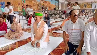 केंद्रीय मंत्री अर्जुनराम मेघवाल सुबह बीकानेर पहुंचे। रेलवे स्टेशन पर स्थित हॉल में मेघवाल ने एक योग कार्यक्रम में हिस्सा लिया। इसके लिए रेलवे ने देर रात तक तैयारियों को अंतिम रूप दिया। इसके अलावा जिला प्रशासन की ओर से भी योग दिवस पर विशेष आयोजन रखा गया है। जिला से भी योग दिवस पर विशेष आयोजन रखा गया है। जिला प्रशासन और आयुर्वेद विभाग की ओर से रेलवे ग्राउंड में योग दिवस मनाया जा रहा है। इस दौरान प्रशासनिक अधिकारियों के साथ ही आम लोगों को रेलवे ग्राउंड में बुलाया गया है। एक अनुमान के मुताबिक एक हजार से ज्यादा लोग रेलवे ग्राउंड में एक साथ योग कर सकते हैं। ये नेताओं का योग है। केंद्रीय मंत्री अर्जुनराम मेघवाल ने जहां योग के सभी आसन किए, वहीं पास में भाजपा अल्पसंख्यक मोर्चे के प्रदेशाध्यक्ष चंपालाल गैदर, राज्यमंत्री का दर्जा प्राप्त रामप्रताप सुथार, डिप्टी मेयर राजेंद्र गहलोत ने एक ही गद्दे पर योग कर डाला।
